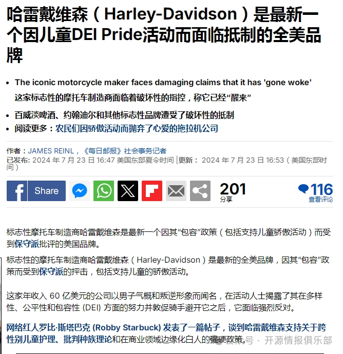 美國網友及各界人士如今對哈雷戴維森的憤怒與約翰迪爾(John Deere)和百威淡啤(Bud Light)遭遇的類似強烈反對如出一轍,這兩家公司均因與跨性別網紅合作而損失了數百萬美元的銷售額。