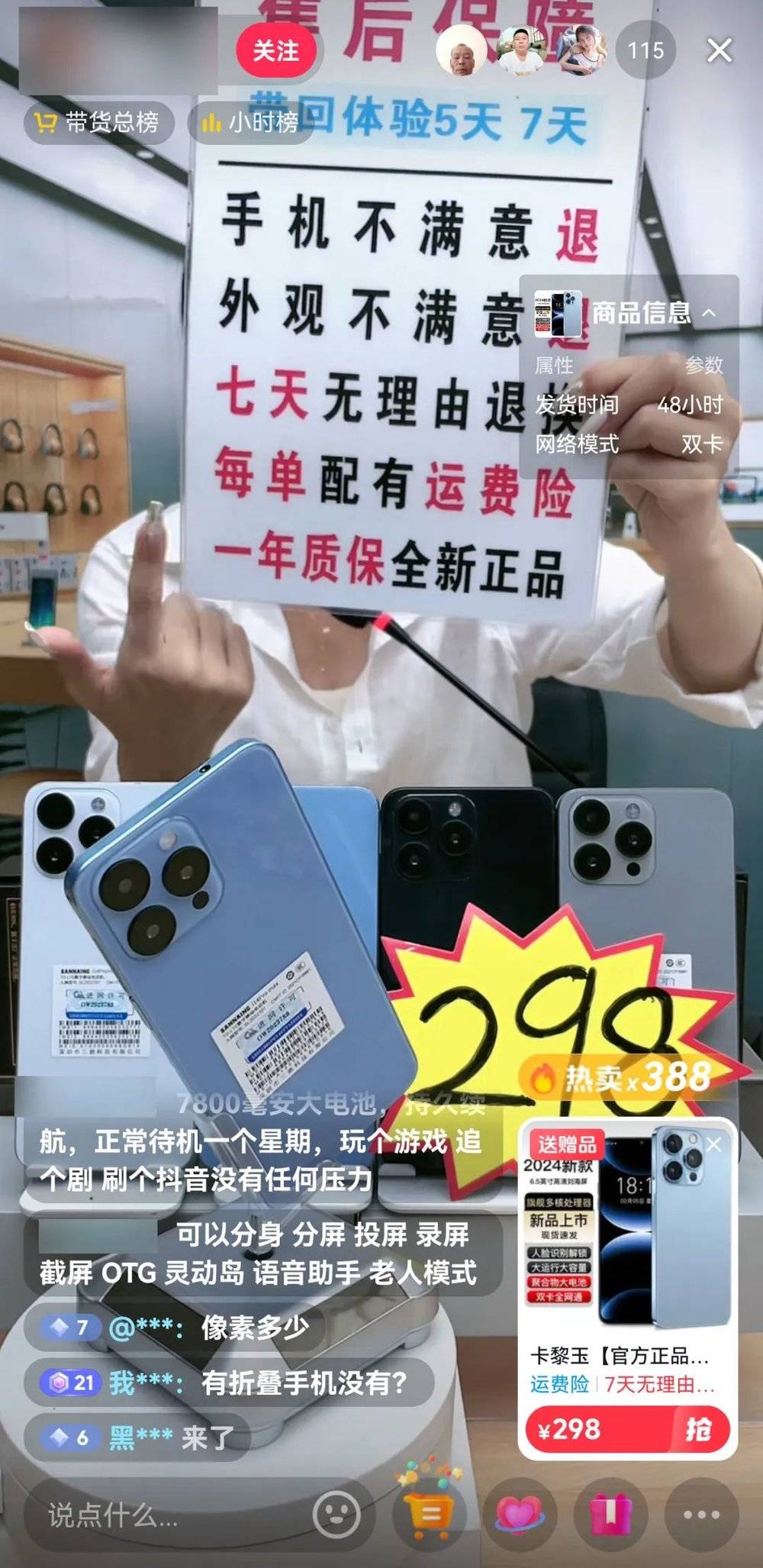 “不要3999,不要2999,只要一頓飯錢,就能把1024GB內存的國產5G手機帶回家。”在抖音等平台的直播間裏,主播正聲嘶力竭地激情叫賣着。這些外觀酷似iPhone 15、華為Pura70的全新手機,只要298元起售。
