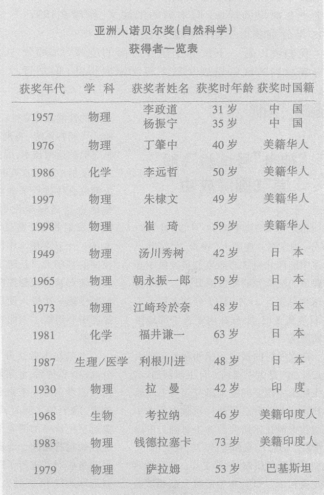 在物理方面,1973年江崎獲獎之後,直到20世紀90年代,沒有一位日本人獲得諾貝爾物理獎,雖然近年來日本在科學技術方面投入了極大量的資金。這是一個十分突出的現象。而華裔的朱棣文、崔琦在1997、1998年分別獲得了諾貝爾物理獎。