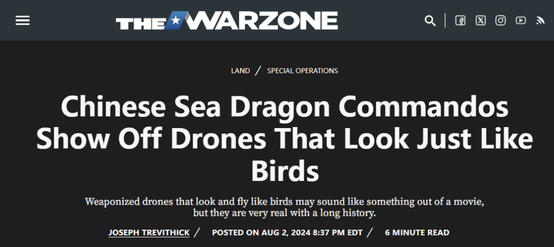 中國海軍陸戰隊的特種部隊“蛟龍突擊隊”使用仿真鳥外形的偵察無人機,讓外國軍事觀察家們再度破防了——都知道中國是無人機大國,但估計他們真是沒有想到,解放軍已經把無人機搞出了這麼多花樣。看着“蛟龍突擊隊”投擲多型外形與小鳥高度相似的仿生撲翼無人機時,美國“動力”網站不由得感嘆稱,這一切就如同是從好萊塢動作片裏直接截取的。
