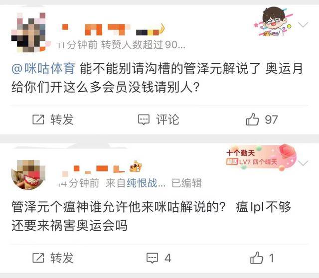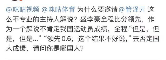 而更有爭議的是咪咕聘請了電競解説員管澤元, 他來解説游泳和射擊,被指專業不算對口。另一方面是管澤元此前因多次預判失誤被標註為“毒奶”體質。