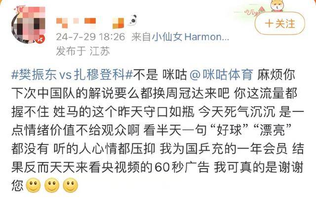 不止女籃賽事,在樊振東vs扎穆登科的比賽中,解説員馬行飛也被一眾網友吐槽稱,他的解説守口如瓶、死氣沉沉,並沒有給觀眾情緒價值,“我為國乒充的一年咪咕會員,結果還要去看央視頻的60秒廣告。”