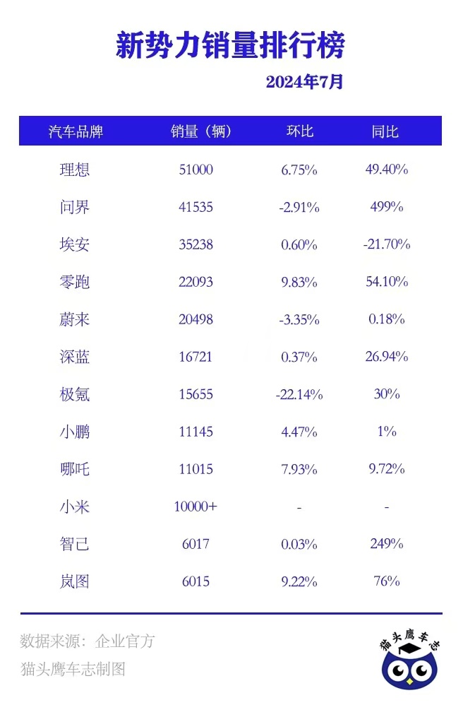 8月1日,理想汽車公告中宣佈,7月交付新車51000輛,創月交付量歷史新高,同比增長49.4%。截至2024年7月31日,理想汽車累計交付873345輛,位居中國新勢力品牌總交付量第一。