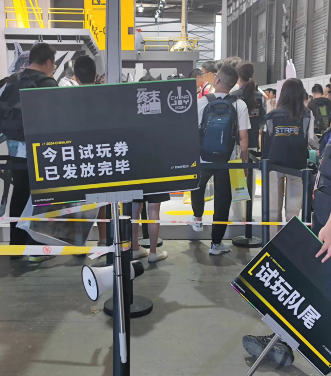 另一邊,鷹角網絡的展位同樣人聲鼎沸,把近年來的二次元品類熱展現得十分具體。當我賊心不死地繞過人羣,來到鷹角新作《明日方舟:終末地》試玩隊伍的末尾時,卻猝不及防地撞上了“今日試玩券已發放完畢”的貼心公告。
