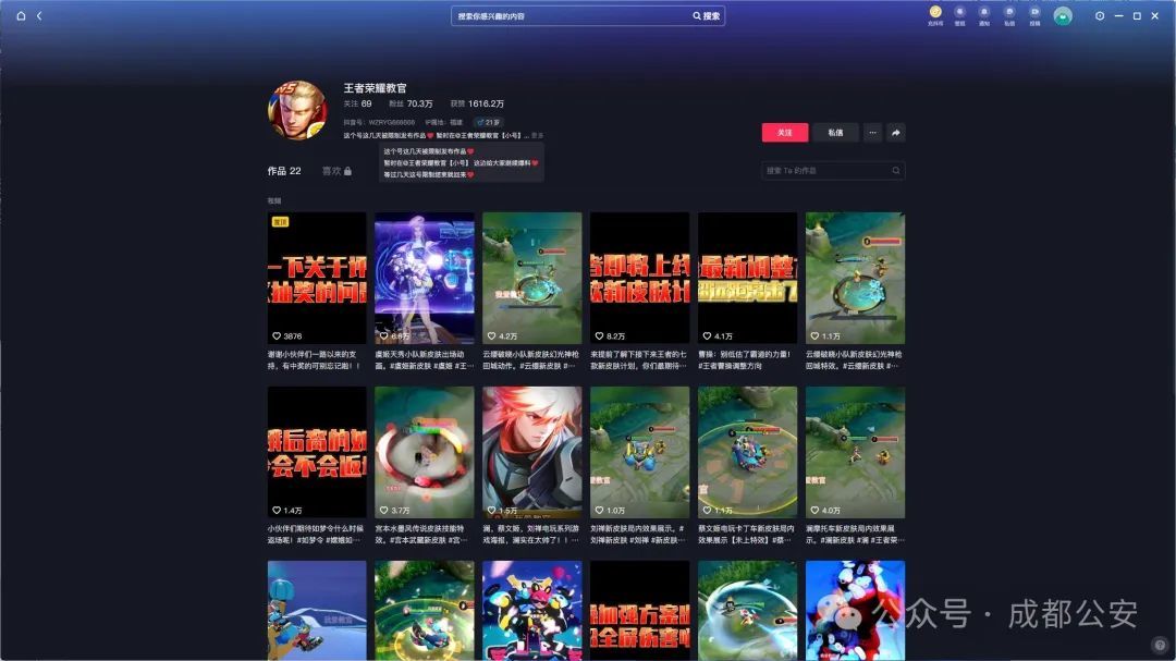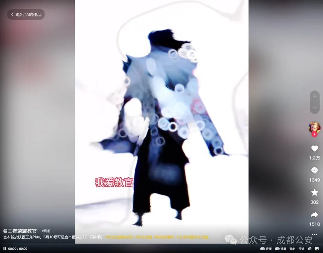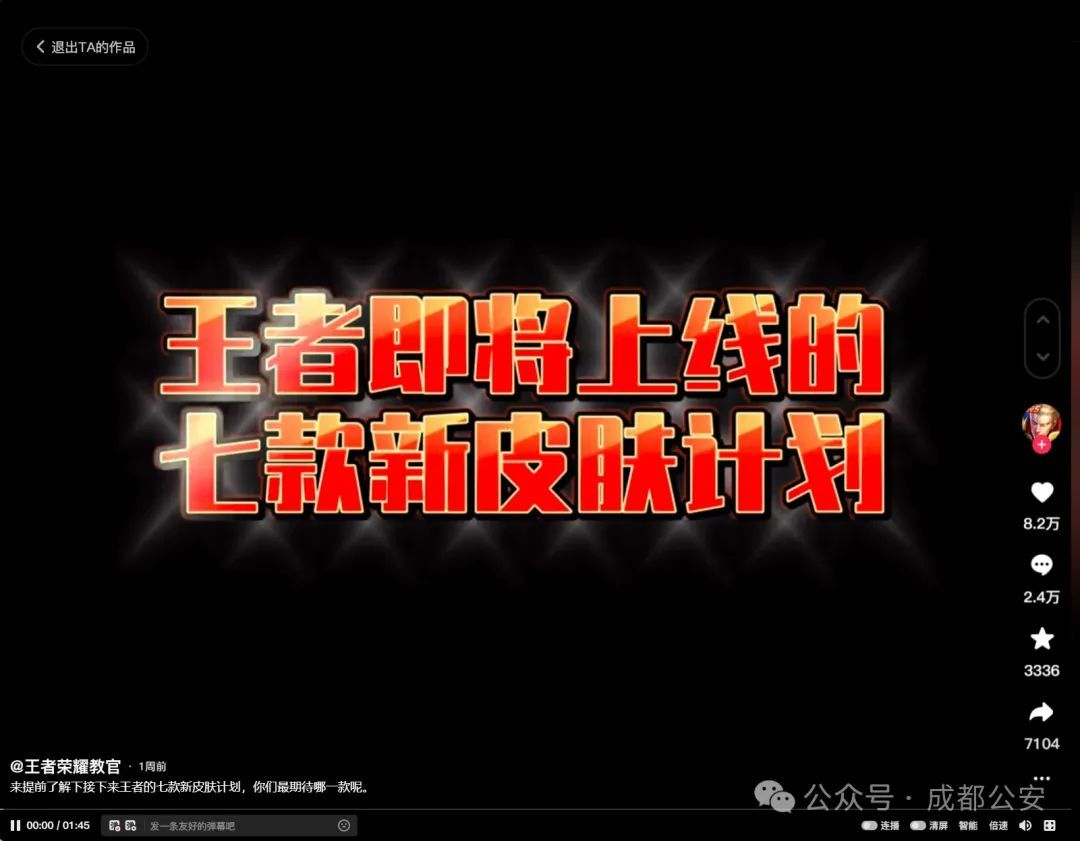 2023年5月,成都市公安局高新區分局知識產權雲警務室收到轄區騰訊科技(成都)有限公司上傳的一份報案材料。作為遊戲《王者榮耀》的著作權人,該公司發現遊戲內尚未發佈的角色皮膚等研發內容在多個網絡平台上被一博主以視頻形式廣泛傳播,嚴重影響了該遊戲的開發與宣傳工作,同時造成了嚴重的經濟損失。