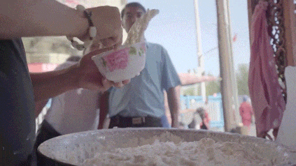 如果你在像現在一樣驕陽似火的夏天看到大街上眾多人聚集在一起,那麼基本可以斷定他們是一羣等着喝一碗酸奶刨冰解暑的人們,酸奶刨冰也是在外地上學的新疆娃娃們的最愛。