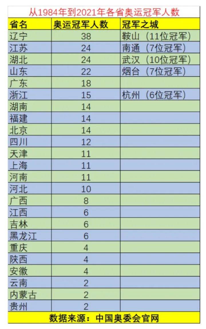 從奧運冠軍數量上看,遼寧幾乎是斷檔式領先。截至2021年東京奧運會,遼寧省冠軍人數達到38位,遠超並列第二的湖北與江蘇。而經濟多年霸榜中國的廣東,只能排在第五。
