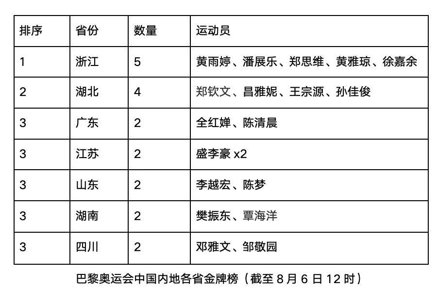 **目前,拿到本屆奧運會冠軍的浙江籍運動員已多達5人,高舉內地省份第一。**這5人分別是黃雨婷、潘展樂、鄭思維、黃雅瓊以及徐嘉餘。