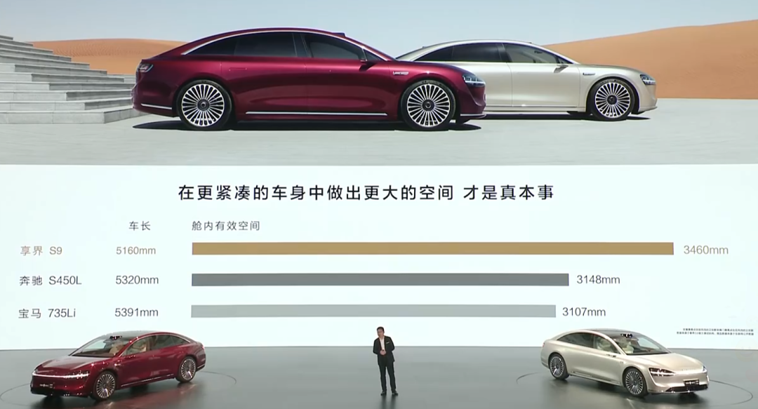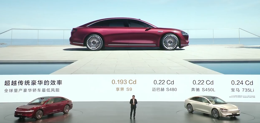 為了證明享界 S9 是一台合格的老闆座駕,發佈會上,餘大嘴也是找了老闆們很喜歡買的邁巴赫、寶馬 7 系這些車,從頭到尾對標了個遍。不管是車內空間、風阻係數,享界 S9 都能超越。