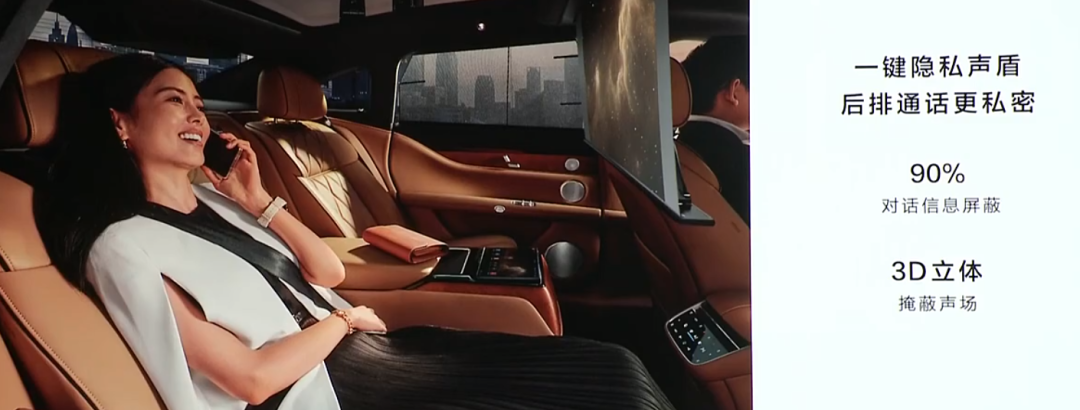 這一套全方位遮擋保護隱私還不夠,享界 S9 還有個後排的隱私聲盾功能,就是把後排乘客對話聲音打亂放給前排,這樣前排完全聽不出你在説啥。