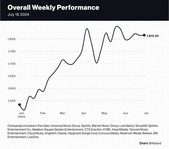 全球音樂指數(Billboard Global Music Index,BGMI)是Billboard推出的一個用於追蹤全球音樂行業主要公司股票表現的股票市場指數,旨在反映音樂產業的健康和趨勢。其計算方式類似於道瓊斯指數等股票指數,是根據成分公司的市值和股票表現來加權計算的。該指數自今年1月震盪走勢,於今年6月底漲至1815.54點。