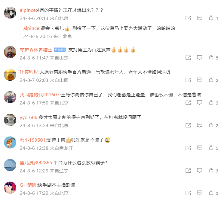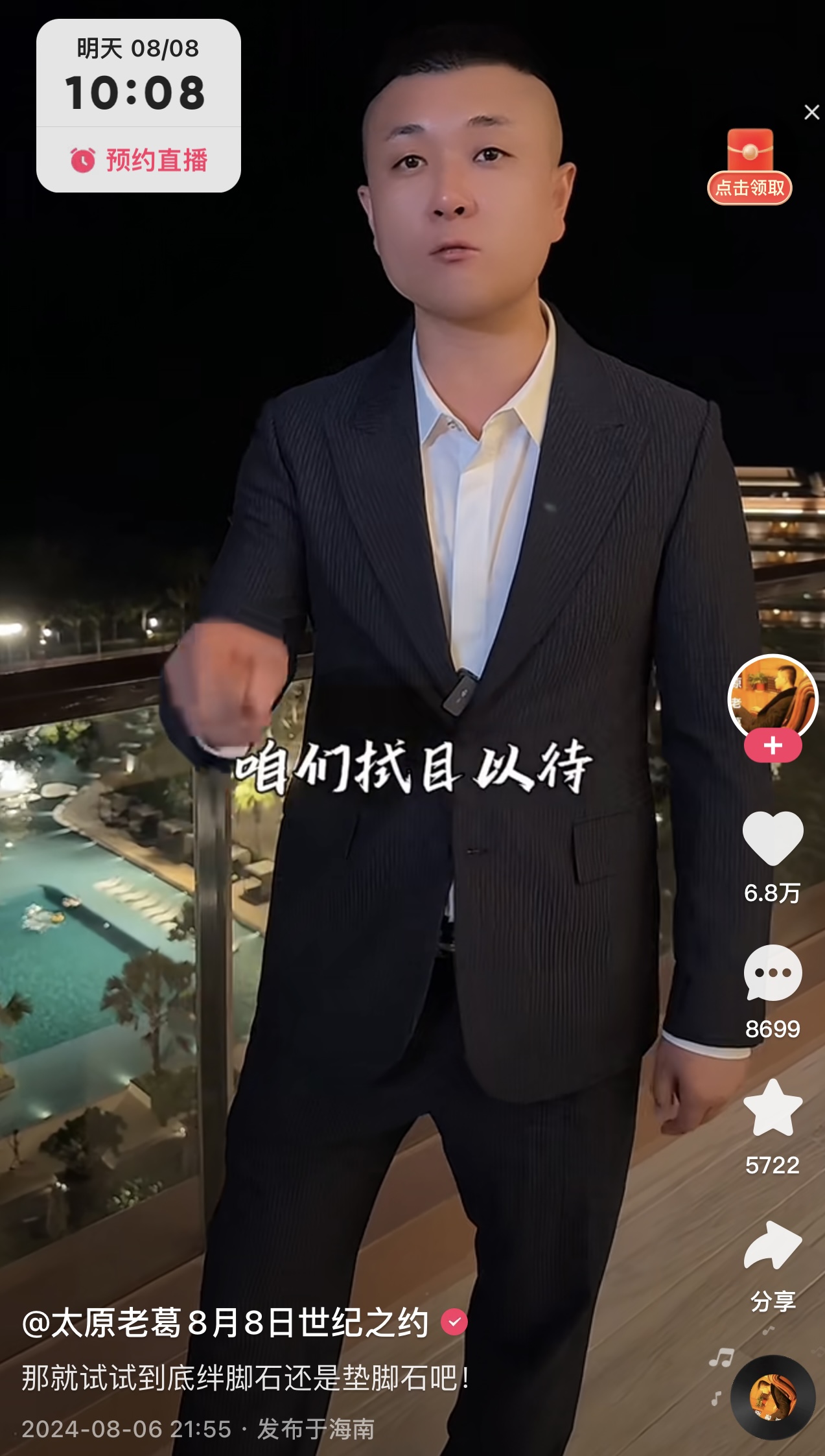 去年發生的事件,在這個時候曝光。因此,也有人猜測,可能是有人故意給老葛8月8號的活動拆台。但老葛似乎也並未受到影響,只是在王海發佈微博當天晚上發佈了一個視頻,很有可能是對王海微博的回應。“總有那麼一小幫人想成為我的絆腳石,擋住我前進的路。”老葛在視頻中還是一如既往的狂:“太原老葛就是這麼狂,你不但成為不了我的絆腳石,反而是我的墊腳石,咱們拭目以待。”