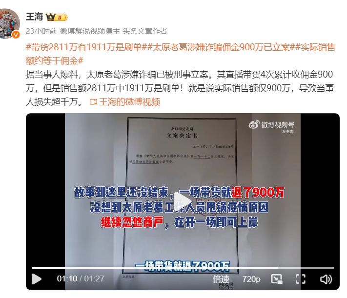 就這樣,太原老葛先後四次直播,累計銷售額為2811萬。但王海發文稱,其中1911萬元是刷單數據,並附帶了商家提供的大量退款清單。商家表示,損失上千萬。目前,商家已經報警。
