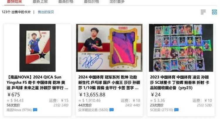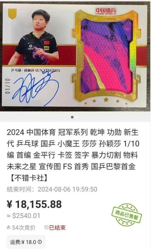 此外,還有消息稱,一張孫穎莎的10編首編球衣簽名卡於8月6日晚上截標,成交價達到了18155.88元。