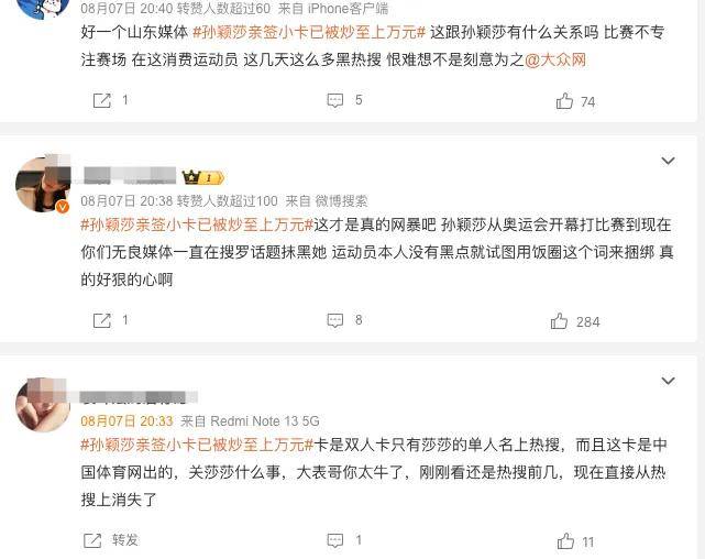 也有人表示:「這個小卡發行是哪裏?所有權是哪個單位?這個東西球迷都不知道,從粉絲到小卡,我看不是球迷飯圈,而是這一系列的熱搜針對性太強,手段太飯圈了,孫穎莎本人還在奧運賽場比賽,為國出戰,為什麼要這麼對她?」
