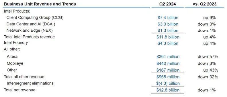 英特爾(INTC.O)2024年第二季度財務報告數據顯示,第二季度收入為128億美元,較上年下降1%,毛利率38.7%;GAAP(通用會計準則)下,淨利潤虧損16億美元。英特爾寄予厚望的晶圓代工,營收為43億美元,環比下降1%。