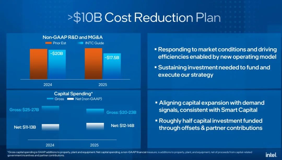 英特爾給自己開的方子是“降本”。財報發佈同日,英特爾提出了一項到2025年實現降本100億美元的計劃。具體行動包括裁員、簡化產品組合、降低資本支出、暫停派發股息等。