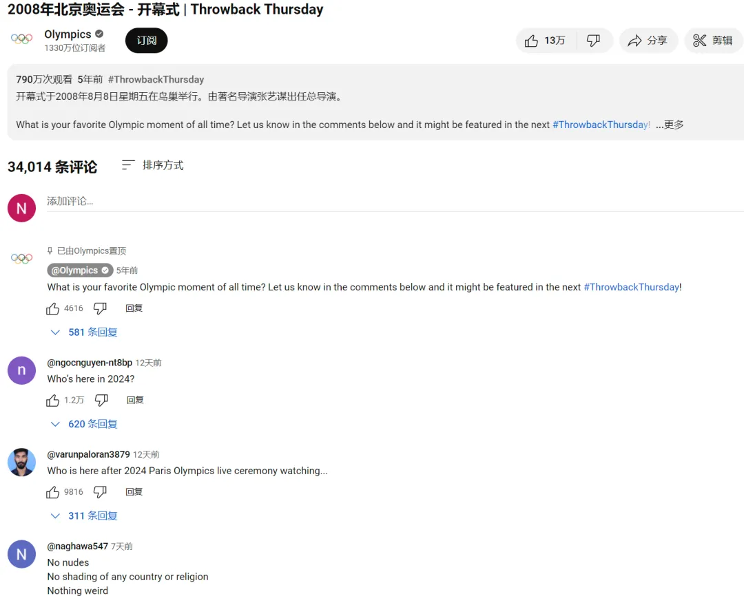 可現實是,每過四年,北京奧運會開幕式的含金量就要上升一輪。尤其是近兩屆東京和巴黎奧運會的開幕式,那真是把陰間和抽象因素甩了個遍。不光中國網友,全球觀眾都不由自主地再次點開北京奧運會開幕式的錄像,點開油管上北京奧運開幕式的評論區,按時間順序排列,基本都是來**“洗眼睛”**的。