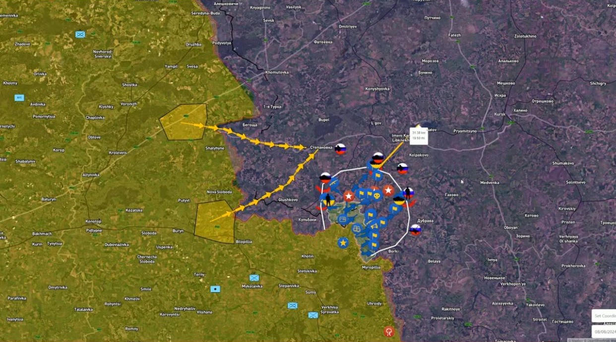 中間深綠色的區域為烏克蘭昨天佔領的俄羅斯土地,而白色區域表明烏克蘭的軍隊在四處出擊,在各個城鎮上都與俄羅斯的部隊有交火。在紅色畫圈的區域基本上有錄像證明俄羅斯軍隊初步抵擋住了烏克蘭軍隊的攻擊。