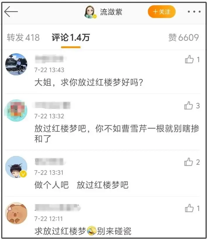 自從流瀲紫宣佈翻拍《紅樓夢》後,她的社交平台就已經淪陷了,網友留言求放過,不要碰瓷《紅樓夢》。