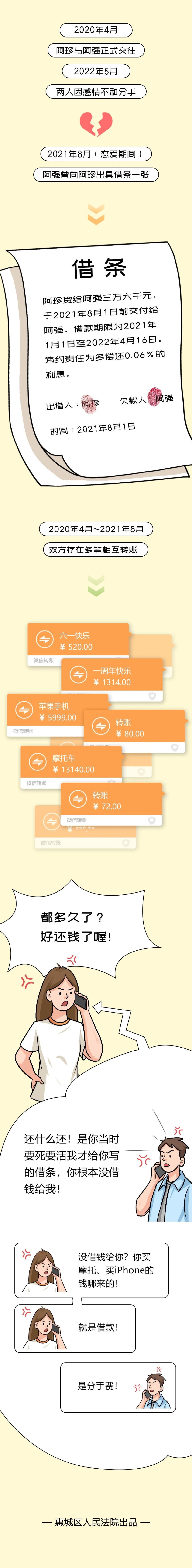 “這三萬六不是一次性付的,是我們交往以來累積的,有微信轉賬記錄為證!他之前明明認賬了,所以才有的借條。但現在又反口不肯還了!要不是借我的錢,他哪有錢買手機、出去旅遊、還買了摩托車!”