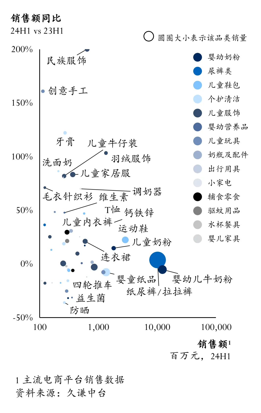 牛奶粉在嬰幼兒細分品類中市場規模最大,24H1線上主流電商平台銷售額超百億元,但增速小幅下滑。而嬰幼兒紙尿褲/拉拉褲品類的市場規模大且實現了小幅增長。