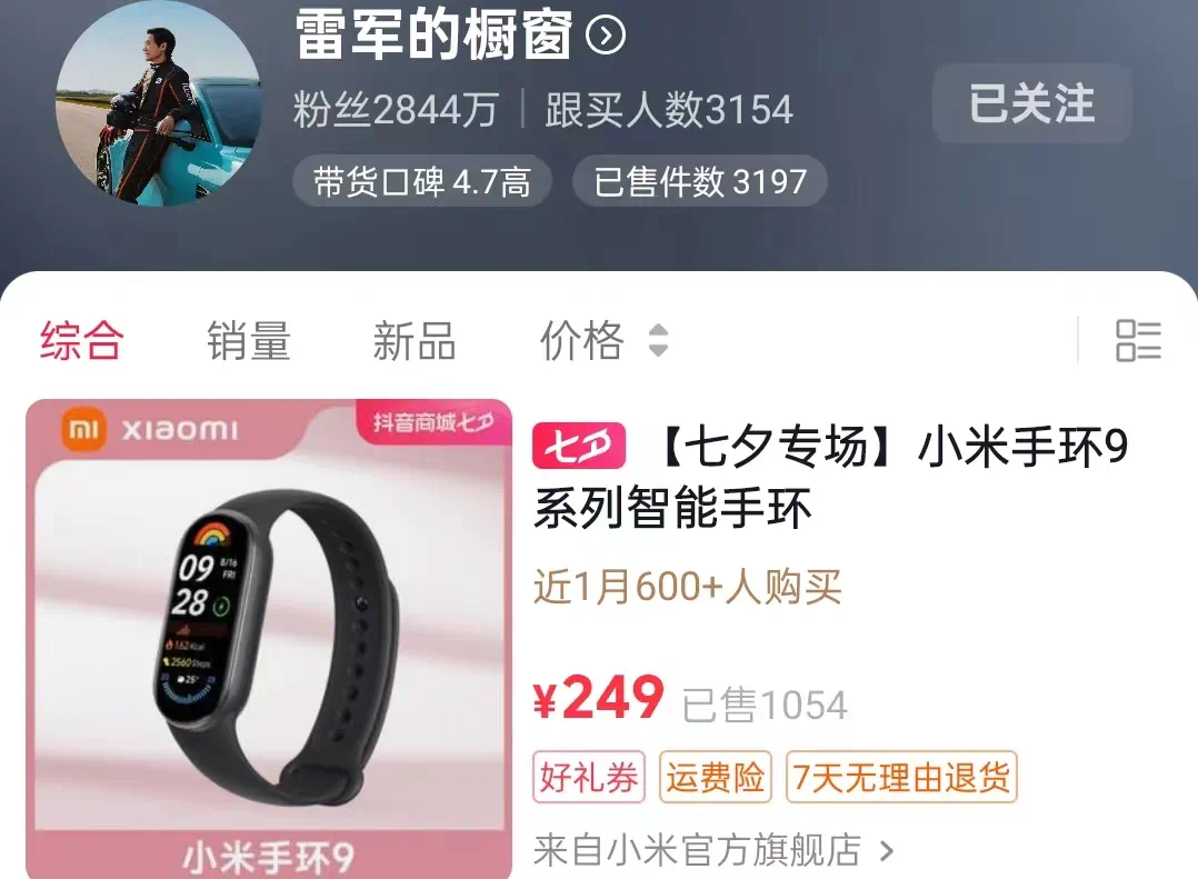 但是,不到一週時間,雷軍似乎後悔了。8月9日,打開雷軍商品櫥窗發現,顯示為“0件好物”。原本掛在商品櫥窗的小米手環9消失了。一件商品也沒有了。