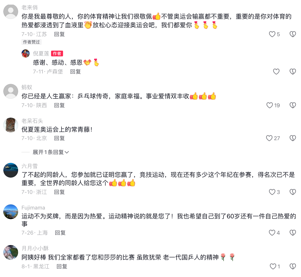 她總喜歡在視頻的開頭説一句“大家好呀”,接着將要分享的事娓娓道來。評論區裏,很多人直言自己因為倪阿姨愛上了乒乓球,將她視為榜樣。因為她的奧運故事,很多人對奧運精神也有了新的理解。畢竟,已經年逾六十的她,仍堅持在奧運賽場上,就是對奧運精神最好的詮釋。