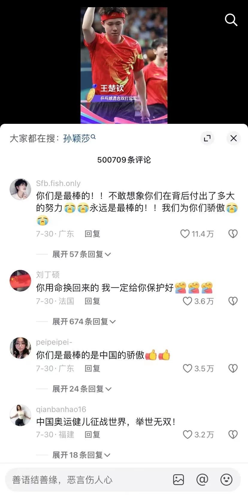 “球拍被踩”事件後,王楚欽參加男子乒乓球單打爆冷出局,他的抖音評論區中鋪滿了加油守護的聲音。
