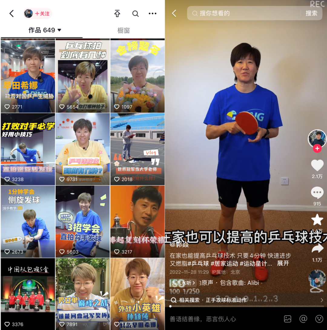 成為國家隊教練員後,郭焱曾將丁寧一路帶至奧運會的最高領獎台,如今退役,她在抖音繼續着自己熱愛的乒乓球事業,關注奧運會只是其中的一種方式。更多時候,郭焱喜歡分享一些與乒乓球有關的知識,並在線教授相關的打法和技巧。
