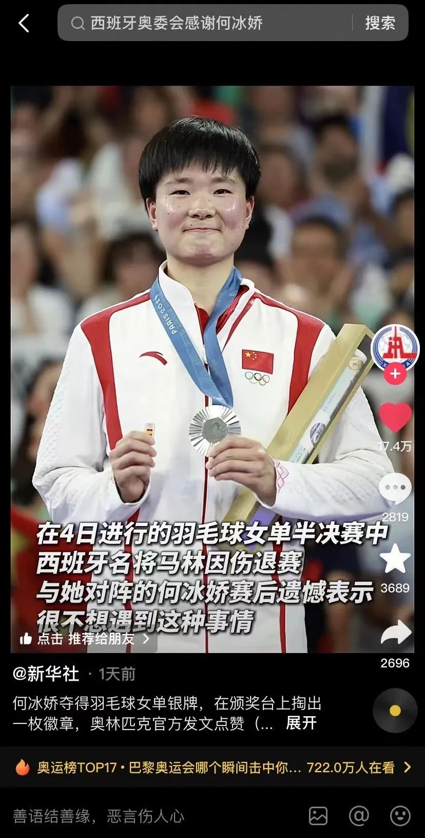 羽毛球女單半決賽中,何冰嬌對戰西班牙選手馬林,後者在領先優勢下因傷出局,何冰嬌進入決賽。最後的領獎台上,摘得銀牌的何冰嬌帶上了西班牙羽毛球隊徽一同領獎。