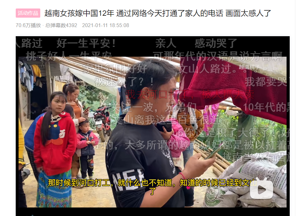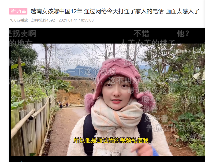 無意間在B站發現了一個UP主,她叫越南桃子,她在中國留學,然後專門幫助那些被拐賣到中國的越南新娘尋親,很是耐人尋味。