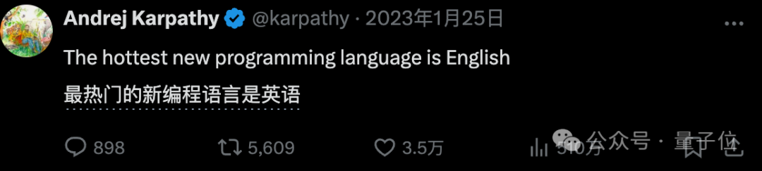 事實上這個理念幾乎已經是AI圈的共識,早在ChatGPT剛發佈的時候,OpenAI創始成員Karpathy就認為,大模型讓英語成了一種編程語言。