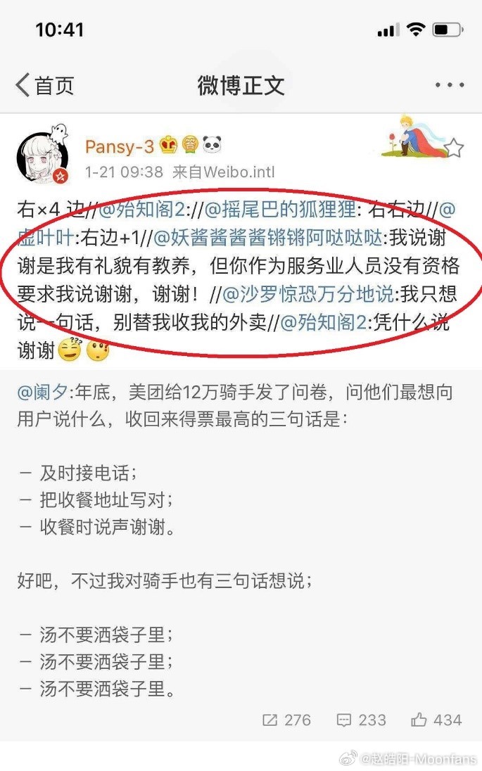 什麼時候待人接物最基本的禮貌在某些人眼裏都成了一種恩賜與特權了?什麼叫“服務業人員沒有資格説要我説謝謝”?科普一下定義,第一產業農業,第二產業工業,第三產業服務業——那麼農民土、工人髒、服務人員沒資格,敢問您是哪個高貴的人種?難不成您是不從事任何生產的貴族,流淌着斯特拉斯堡高貴的血液,我們這些下等人在這個白色的季節裏能服侍您是無上的榮光,怎麼敢要一句謝謝呢?都是爹生娘養誠實勞動合法經營出來討生活的人,誰瞧不起誰啊?
