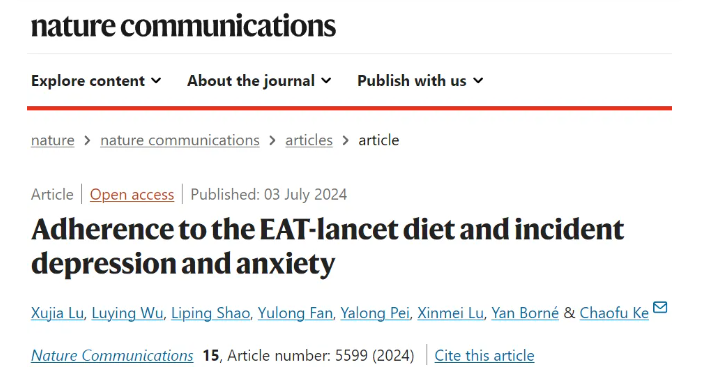 2024年7月3日,蘇州大學柯朝甫團隊在Nature Communications 在線發表題為“Adherence to the EAT-lancet diet and incident depression and anxiety”的研究論文,該研究旨在調查生物樣本庫中180,446名英國參與者堅持EAT-Lancet 參考飲食(EAT基金會和《柳葉刀》雜誌共同制定的一種健康和可持續發展的飲食模式)與抑鬱、焦慮及其共患病的潛在關聯。對EAT-Lancet飲食的依從程度被轉化為三種不同的飲食評分。