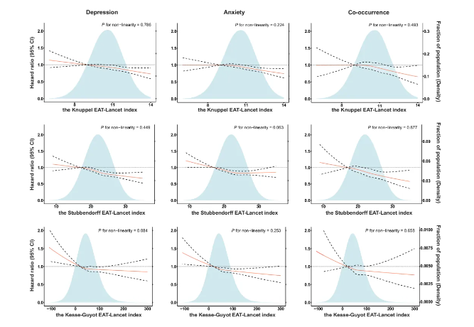 在11.62年的隨訪中,與最低依從性組相比,Knuppel EAT-Lancet指數最高依從性組的參與者表現出較低的抑鬱風險(風險比:0.806, 95%CI:0.730-0.890)、焦慮(0.818, 0.751-0.892)及其共患病(0.756, 0.624-0.914)。Stubbendorff EAT-Lancet指數的相應風險比(95%CIs)分別為0.711(0.627-0.806)、0.765(0.687-0.852)和0.659(0.516-0.841),Kesse-Guyot EAT-Lancet飲食指數為0.844(0.768-0.928)、0.825(0.759-0.896)和0.818(0.682-0.981)。研究結果表明,堅持EAT-Lancet飲食發生抑鬱、焦慮及其共患病的風險更低。