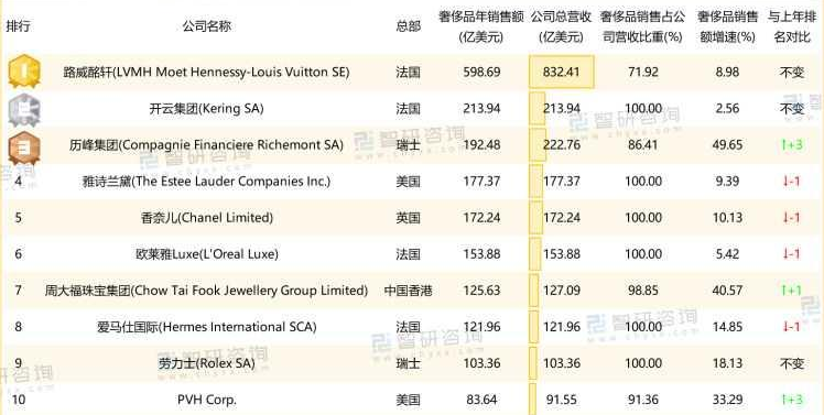 德勤2023奢侈品全球力量報告,公佈了2023年度全球100大奢侈品公司排行榜。