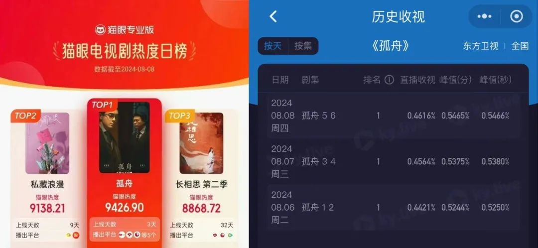 8月6日,該劇在愛奇藝上線,同步在江蘇衞視、東方衞視、北京衞視上星播出。首播當天,酷雲數據顯示,東方衞視峯值收視率居於衞視Top1,全端熱度Top1。貓眼數據顯示,連續兩天,《孤舟》實時熱度登頂貓眼劇集熱度總榜,截至昨晚在貓眼熱度高達9426.9。