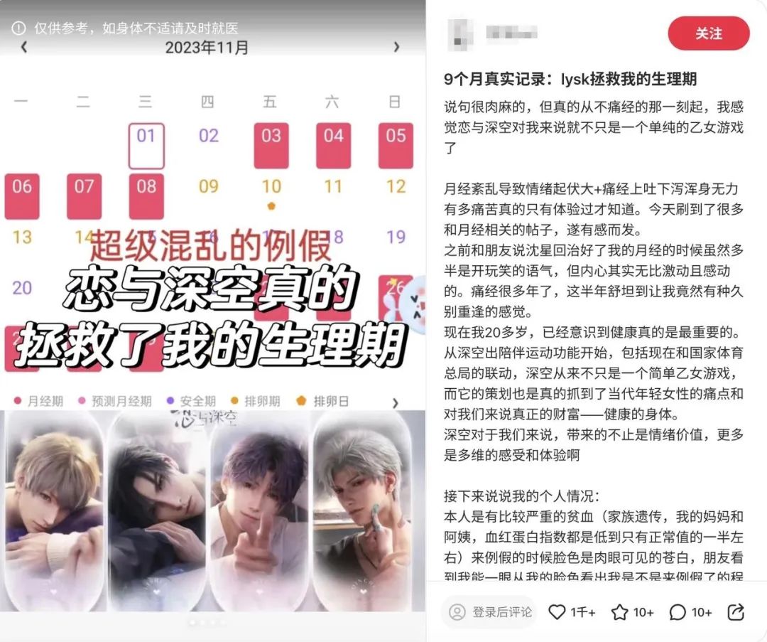 有玩家在社交平台上説:“《戀與深空》拯救了我的生理期,從不痛經的那一刻起,它對我就不只是一個單純的乙女遊戲了。《戀與深空》帶給我的不只是情緒價值,還有多維的感受和體驗。”還有玩家貼出了自己玩《戀與深空》前後的體檢報告對比,一些疾病的症狀確實得到了好轉。不少人因此把《戀與深空》叫做“婦科聖手”“賽博紅糖水”,還提出了“玩《戀與深空》,做健康女人”的口號。