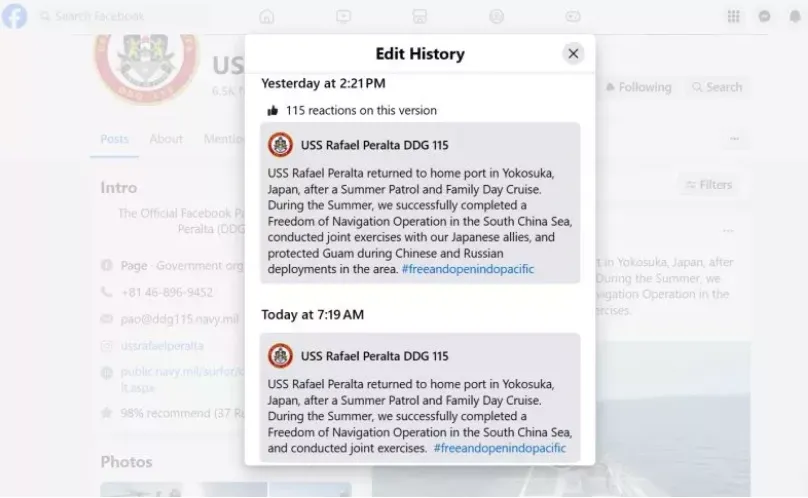 在本月早些時候,“拉斐爾·佩拉爾塔”號完成夏季巡邏後返回橫須賀海軍基地。該艦的臉書官方賬號宣稱,“它在中俄艦艇部署在該地區期間保護了關島”。但不知道是否覺得這事太過於丟人——畢竟中俄海軍艦隊逼近關島這個美國第二島鏈核心地區,實在讓美國海軍臉上無光,美媒注意到,這段話後來被刪除了。