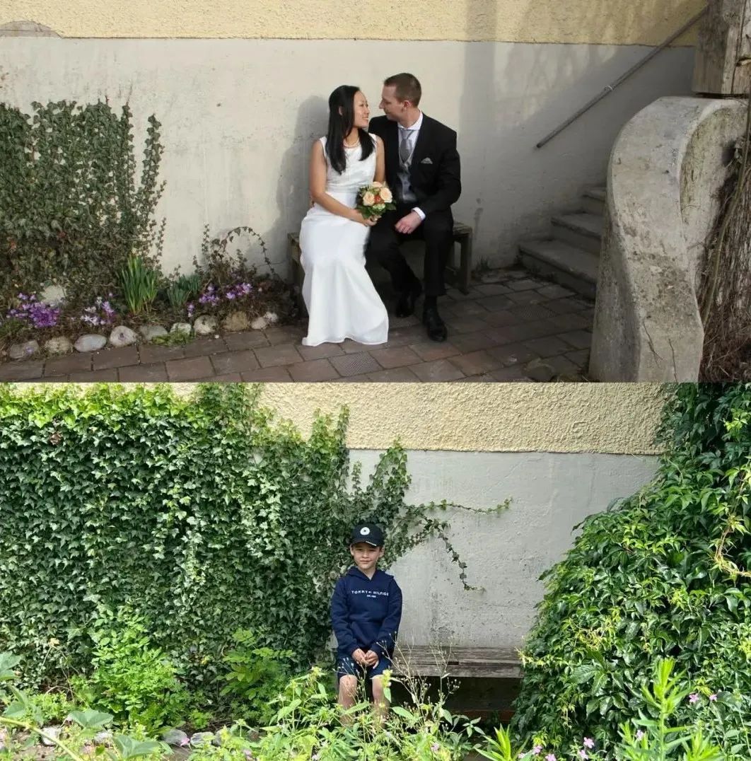 今年夏天,又來散步。七八年過去了,曾經我們拍婚禮照片的地方,已經鬱鬱葱葱,快要看不出原來的樣子,但是木凳子還在。當年的兩個人,現在有了一個小夥子陪伴了。
