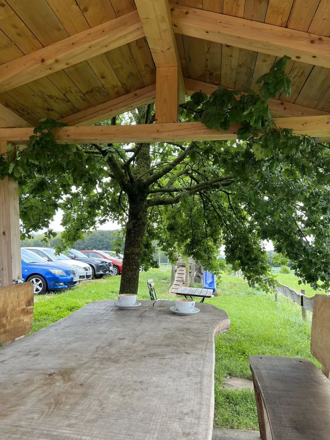 坐在户外的桌椅上喝咖啡,桌子是一根巨大木頭切出的一片,可以看到這棵巨樹的木紋。眼前是一望無際的田野,山坡起伏,像是windows桌面了。