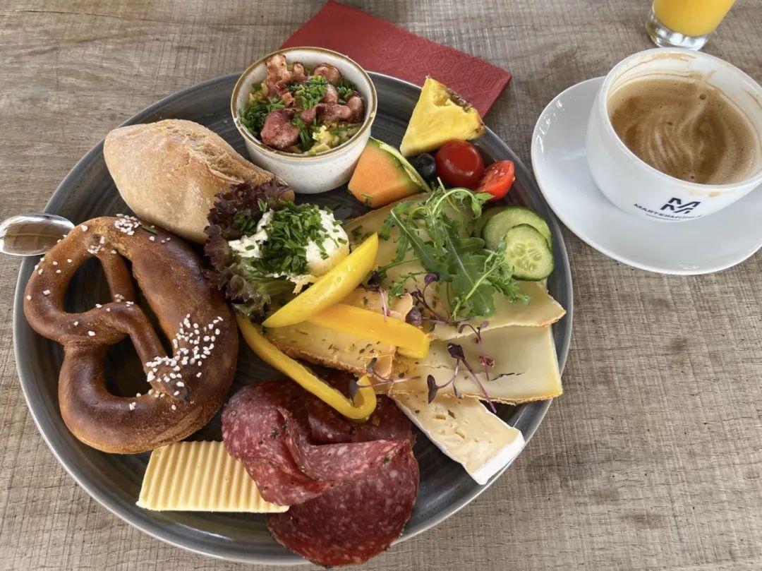 他們家的早餐套餐十分豐富,我最喜歡的套餐名叫“頂峯小憩”,端上來是巨大的一盤,有小麪包,鹼水包,香腸片,雞蛋羹,黃油,水果,還有很多奶酪。