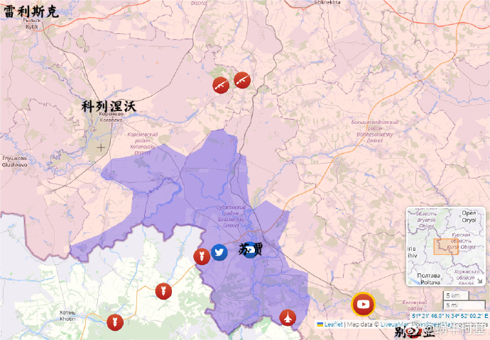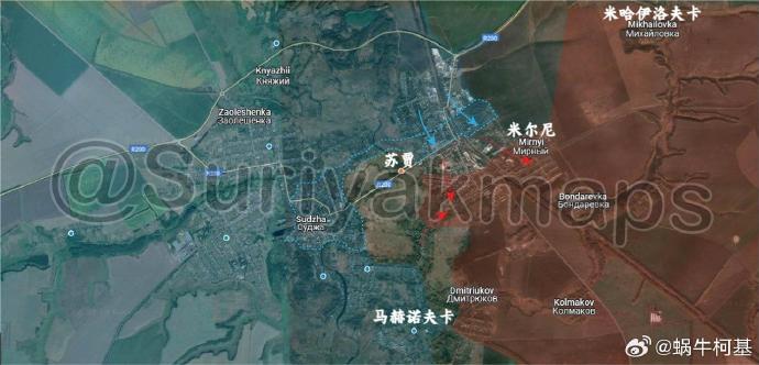 2、蘇賈:烏克蘭軍隊控制着普謝爾河左岸的部分城市。在河對岸,烏克蘭軍隊正在向該市東部推進,而俄羅斯軍隊則撤退到東南郊區。蘇賈目前實際上已在烏克蘭軍隊的控制之下。
