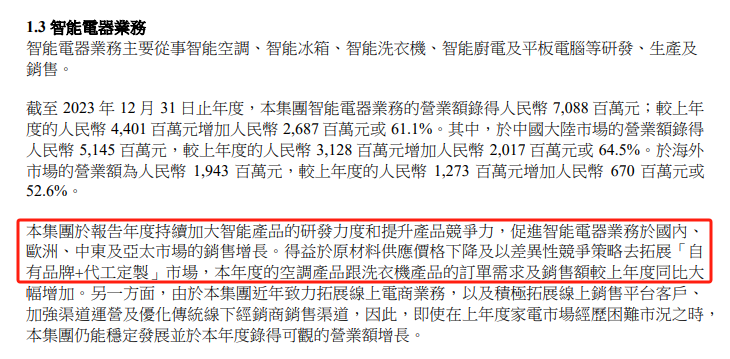 在2023年財報中,創維認為公司整體毛利率下滑的原因之一是:家電原材料價格普遍上漲。但在智能電器業務中,空調、洗衣機產品訂單需求和銷售額大增,則得益於原材料供應價格下降。