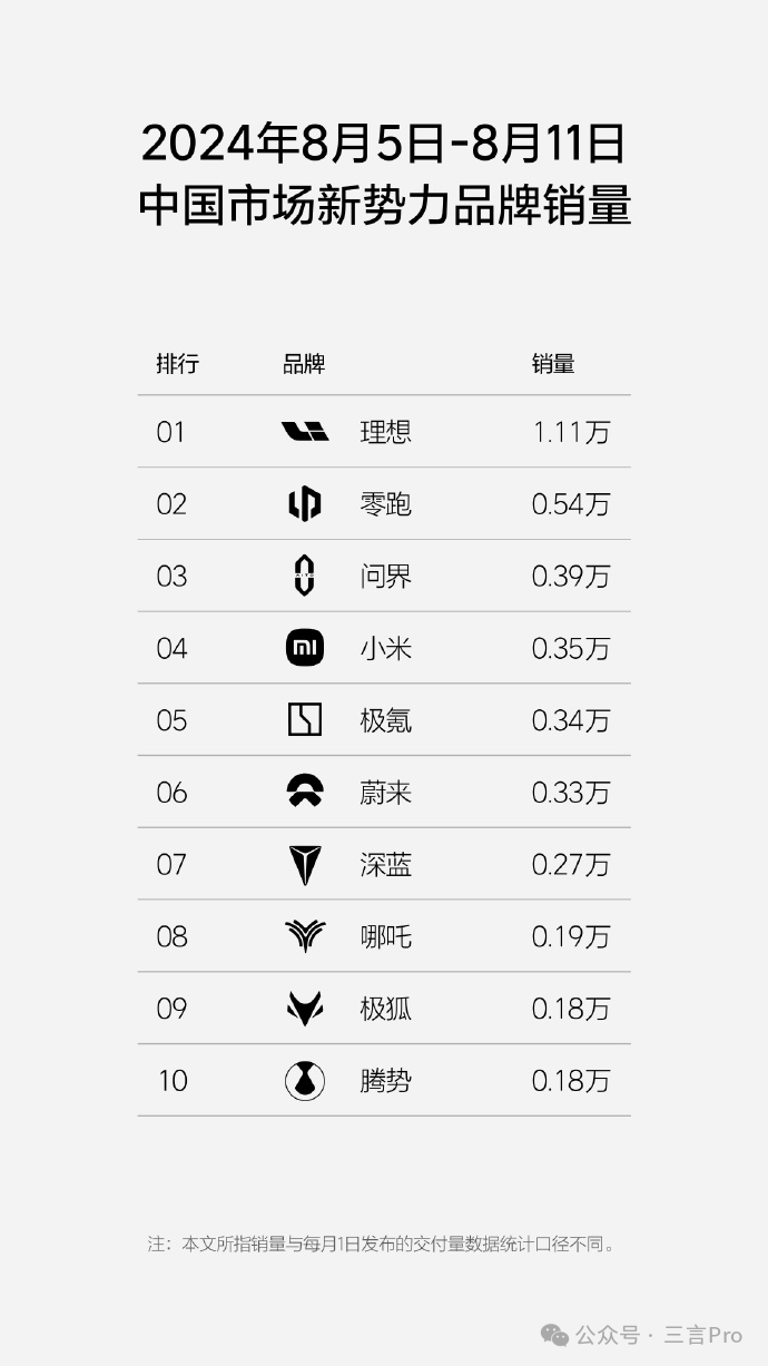 比如,零跑銷量就和之前相差不大。小米成為第4,但32周與30、31周相比僅有400到600輛的銷量差距。