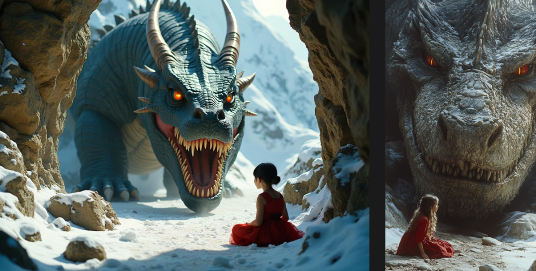 提示詞:一個穿着紅色連衣裙的年輕女孩,坐在一條長着巨大牙齒和眼睛的巨龍旁邊。她正面對它,好像他們是朋友或好警察。這個場景發生在山裏的雪石裏。以詹姆斯 · 卡梅隆的風格拍攝的《 狼的秘密生活 》, 70 年代的電影。