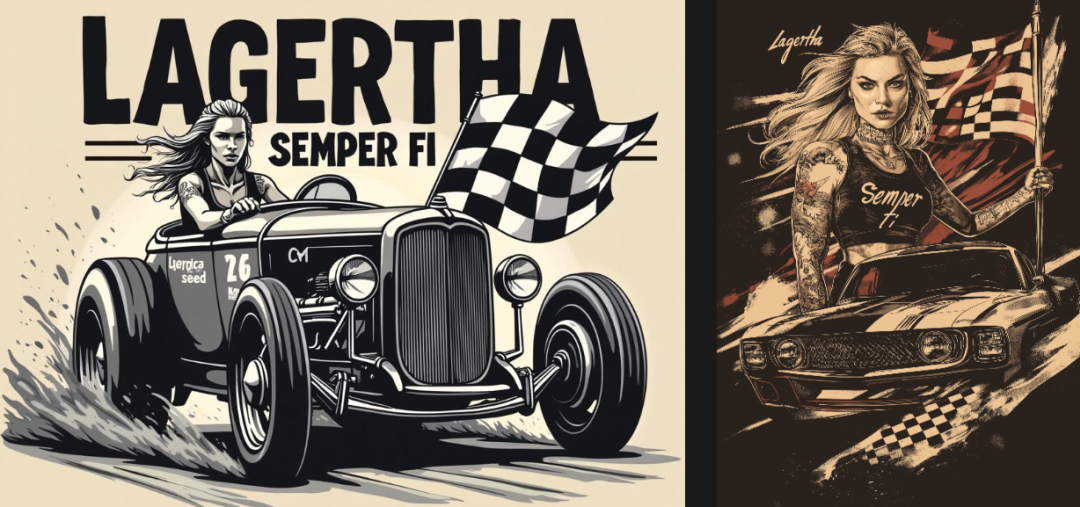 提示詞:復古風格的 T 恤設計以一輛帶有方格旗的老式飆車為特色,並附有文字 “Lagertha” 和 “Semper Fi” ,以單色背景為背景。舉着旗幟的拉格薩身上有紋身。這幅藝術作品的風格捕捉到了她的動作姿勢,展示了車速和維京力量的力量。這是一個高對比度的插圖,突出了他們的運動裝和大膽的文字排版。