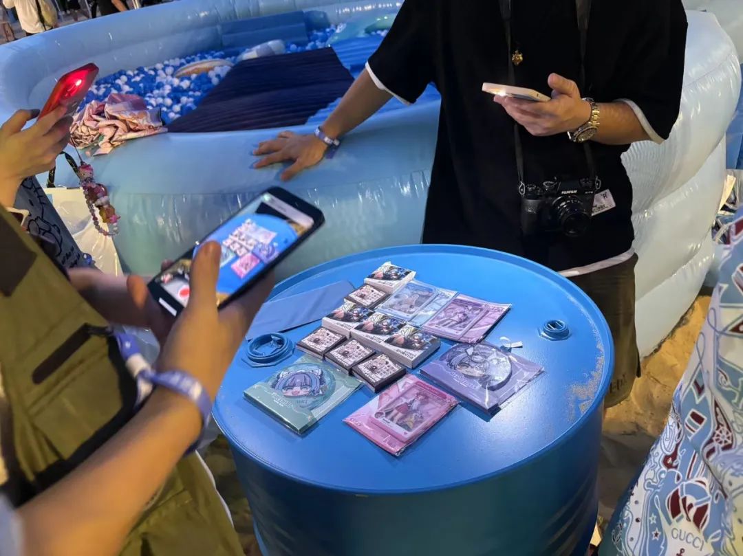 更遠的地方,還有拍着晚上亮燈後小鎮摸樣和閃亮黃雞的玩家,以及在交換今天的周邊無料盲盒的玩家,還有找了個藍色“油桶”當展示台開始給今天買的周邊擺陣的玩家,甚至給周邊擺陣時,他們還會有專人打開手機手電筒打光。