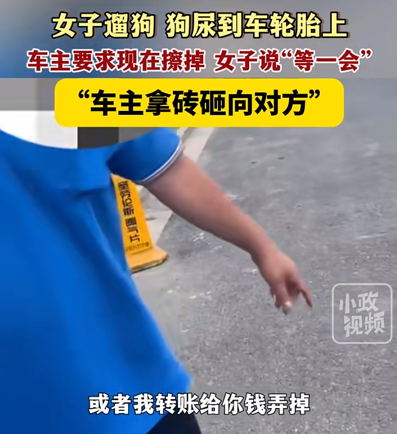 女子遛狗狗尿到了車胎上,車主要求立刻擦女子説等一會,結果車主憤怒拿磚砸向女子_風聞